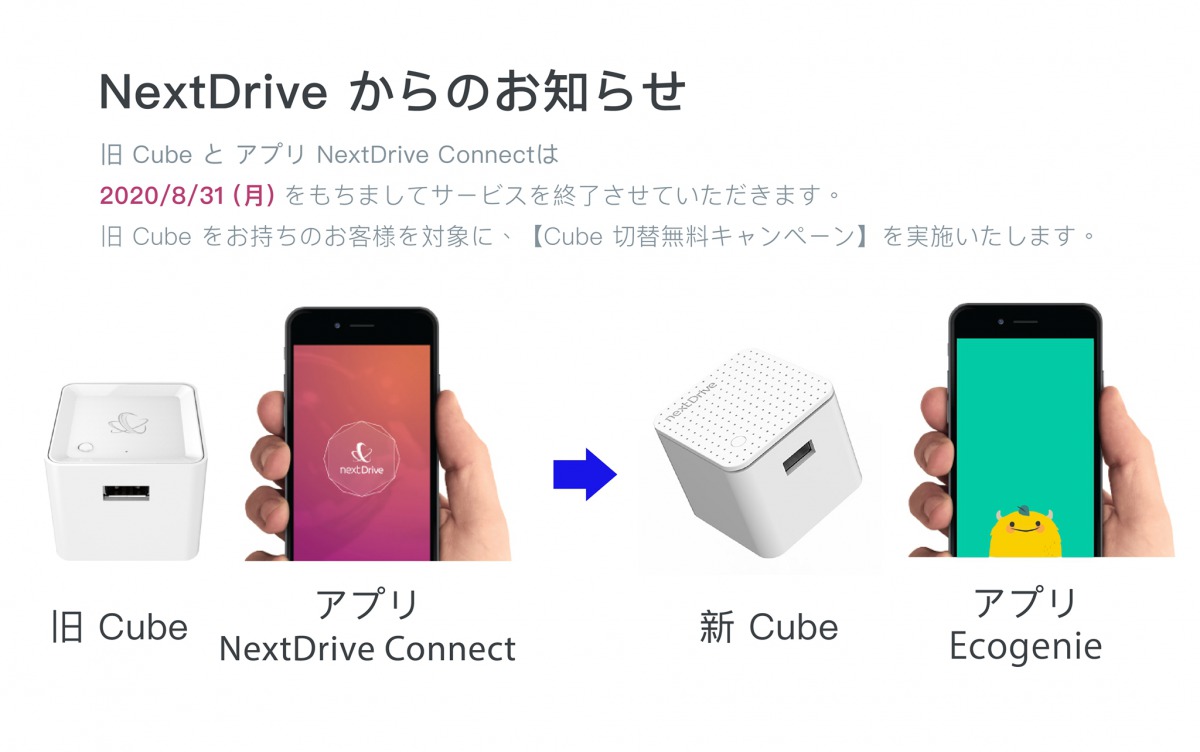 NextDrive は、ホームセキュリティ、温湿度情報、パーソナルクラウドなどの機能を含めたサービスとして、2016 年からアプリ「NextDrive Connect」とゲートウェイ「Cube」を提供しておりましたが、弊社経営方針の変更に伴い、2020 年 8 月 31 日(月)をもちましてサービスを終了させていただきます。