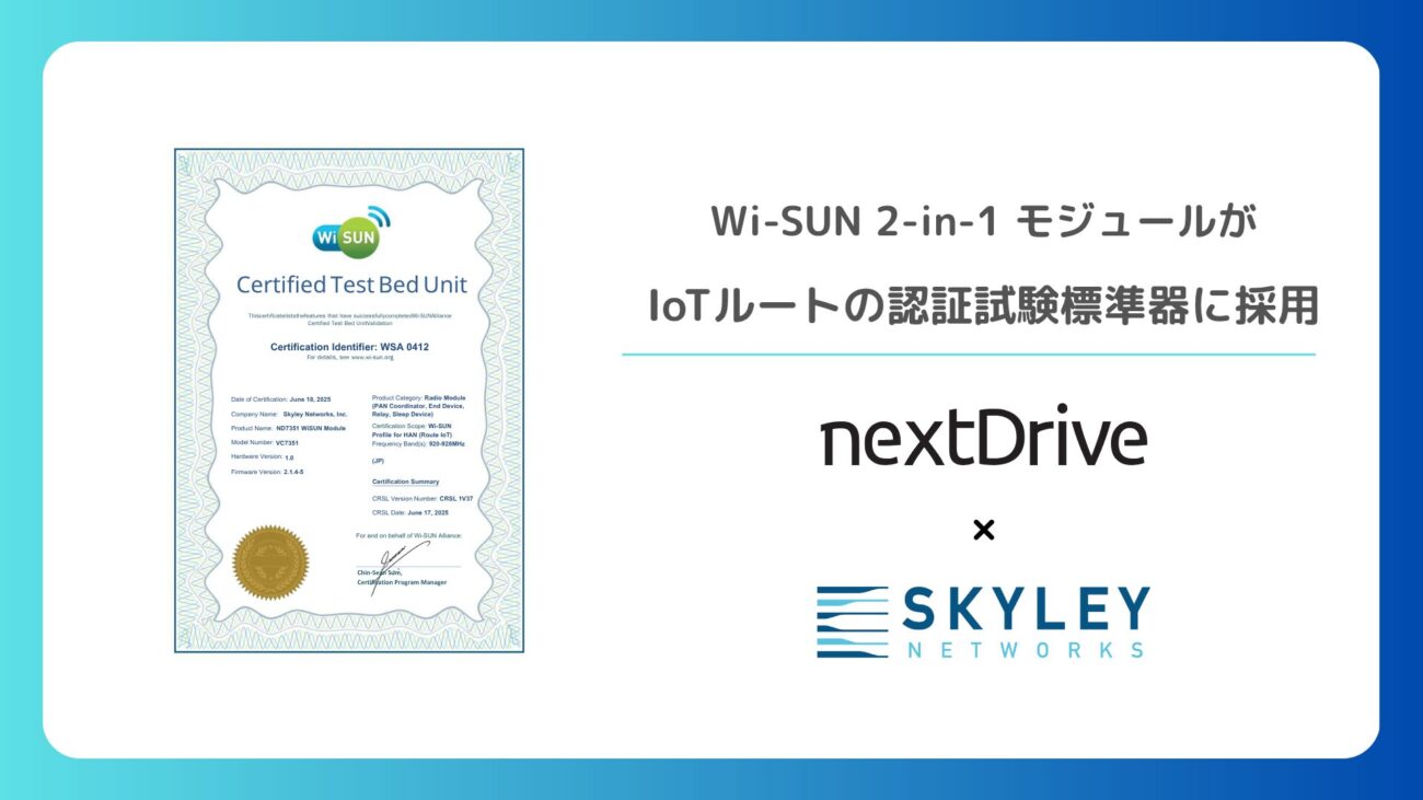 NextDriveとスカイリー・ネットワークスの提供するWi-SUN通信モジュールがIoTルートの認証試験標準器として採用